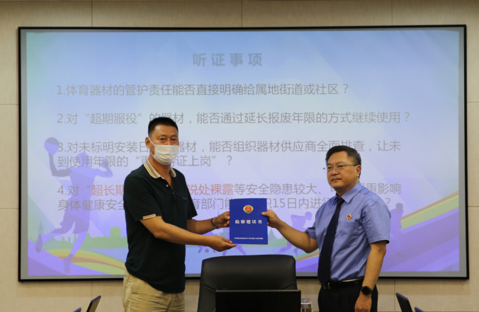 8月8日上午,高新区检察院召开公开听证会,由检察长王玮主持,邀请体育部门、住建部门、相关社区代表、人大代表、政协委员、大健康产业联络员参加。会上,检察官以图文并茂的方式展示了公益调查报告,听取了参会部门、代表的意见。与会人员围绕建立长效机制源头规范监管,开展了深入的分析研判。经过公开听证,大家一致认为,室外健身器材既事关群众切身安全,也事关泰州城市形象和功能品质,各部门应当形成合力,共同推进室外健身器材的维护保养。借助泰州市即将出台《泰州市全民健身条例》这一契机,进一步明确各部门管护责任、共同形成监管合力,利用管理信息化、发挥社会体育指导员作用、落实资金保障等多种形式,建立长效监管维护机制,常态化保障广大人民群众健身安全。最后,检察长公开宣告送达公益诉讼诉前检察建议,相关职能部门当场接收并表示将根据此次听证会的意见,进一步加强监管维护,强化“全民健身”硬件保障。